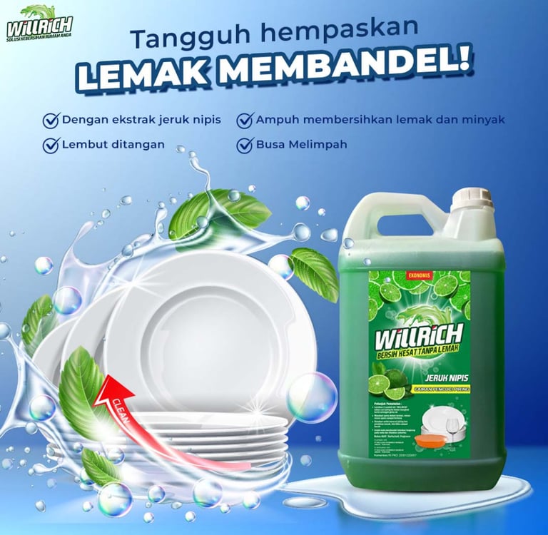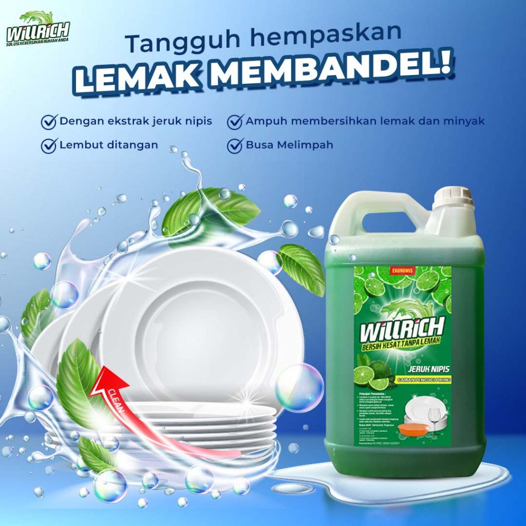 Willrich Sabun Cuci Piring 5 Liter Varian Lime Jeruk Nipis Dengan Bahan Konsentrat Surfactant Untuk Mengangkat Lemak Minyak Pada Cucian Piring Peralatan Dapur Anda Dengan Keharuman Jeruk Nipis Yang Alami Menghasilkan Busa Yang Melimpah.