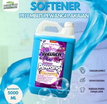 Softener Laundry Willrich adalah produk pelembut pakaian yang dirancang untuk memberikan kelembutan ekstra pada semua jenis kain