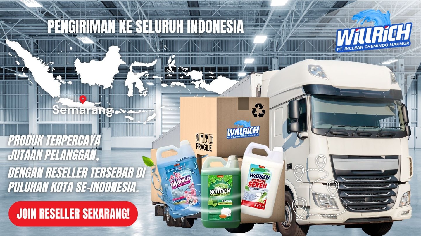 Produk kami meliputi : Pembersih rumah tangga, kantor, gedung, hotel, restoran, rumah sakit, laundry, dan car wash seluruh indonesia. Produk - produk Willrich telah dipercaya oleh jutaan pelanggan dengan standar produksi yang terjaga dan memiliki reseller yang telah tersebar di seluruh Indonesia. Reseller Willrich Semarang tersebar melalui toko plastik, toko grosir, toko di pasar, minimarket, hingga ibu rumah tangga yang ingin menambah pendapatan dengan menjual produk Willrich yang menjual kebutuhan rumah tangga, perkantoran, restoran, perkantoran, laundry, car wash, cleaning servis, dan personal care.